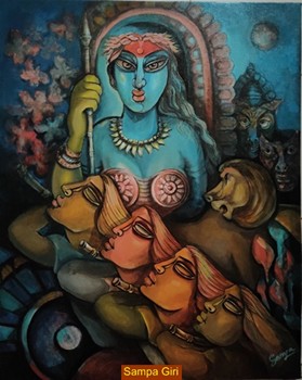These new paintings by Sachin Sagare, like his previous body of work, arrives in a headlong rush of invention festooned upon a canny theme, in this case the female body in nature. He places groups of rural women worshippers; he names them as nymphs, dryads and goddesses into clearings in deep, dark background, thus activating irresistible tropes of an Indian painting tradition meant for royals. A more occult art comes to mind in these unkempt, unruly wildernesses, one which begins with the temple women.